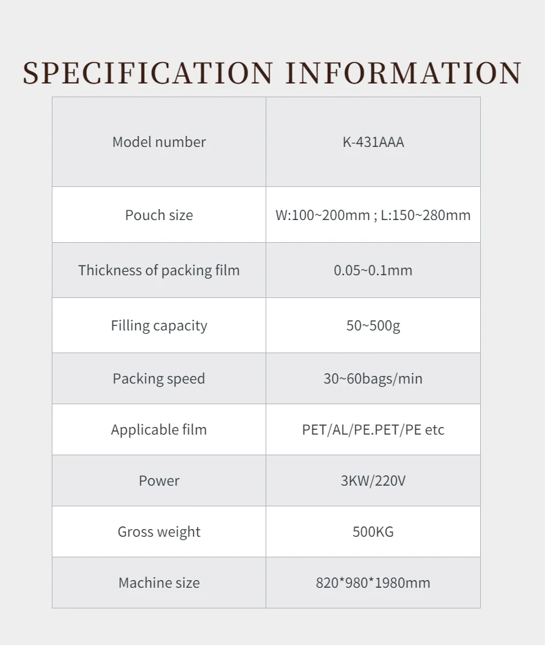 K-431AAA Multifunction Automatic Chocolate Bean Salt Candy Potato Chips Spice Sugar Powder Granule Granular Filling Snack Food Packing Machine