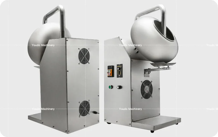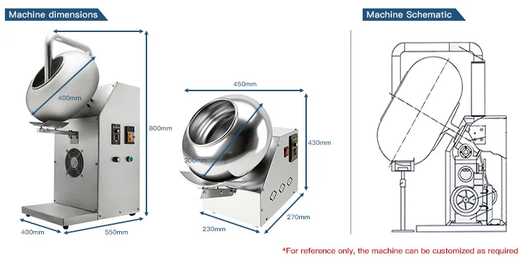 This machine consist of main body, worm wheel box, coating pan, heating device,hot air&common blower,electrical equipment, etc. The transmission process that the motor drive the worm wheel and worm via triangle belt to make the coating pan rotate.Then the material revolve up and down in the coating pan, so that even mixing, pelletizing and polishing can be completed well.