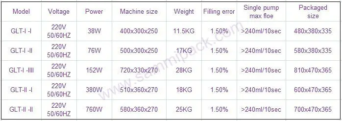 9.GLF-I-I filling volume from 3ml to 5000ml adjustable,GLF-I-II filling volume from 20ml-50000ml adjustable.Easy to operate and control