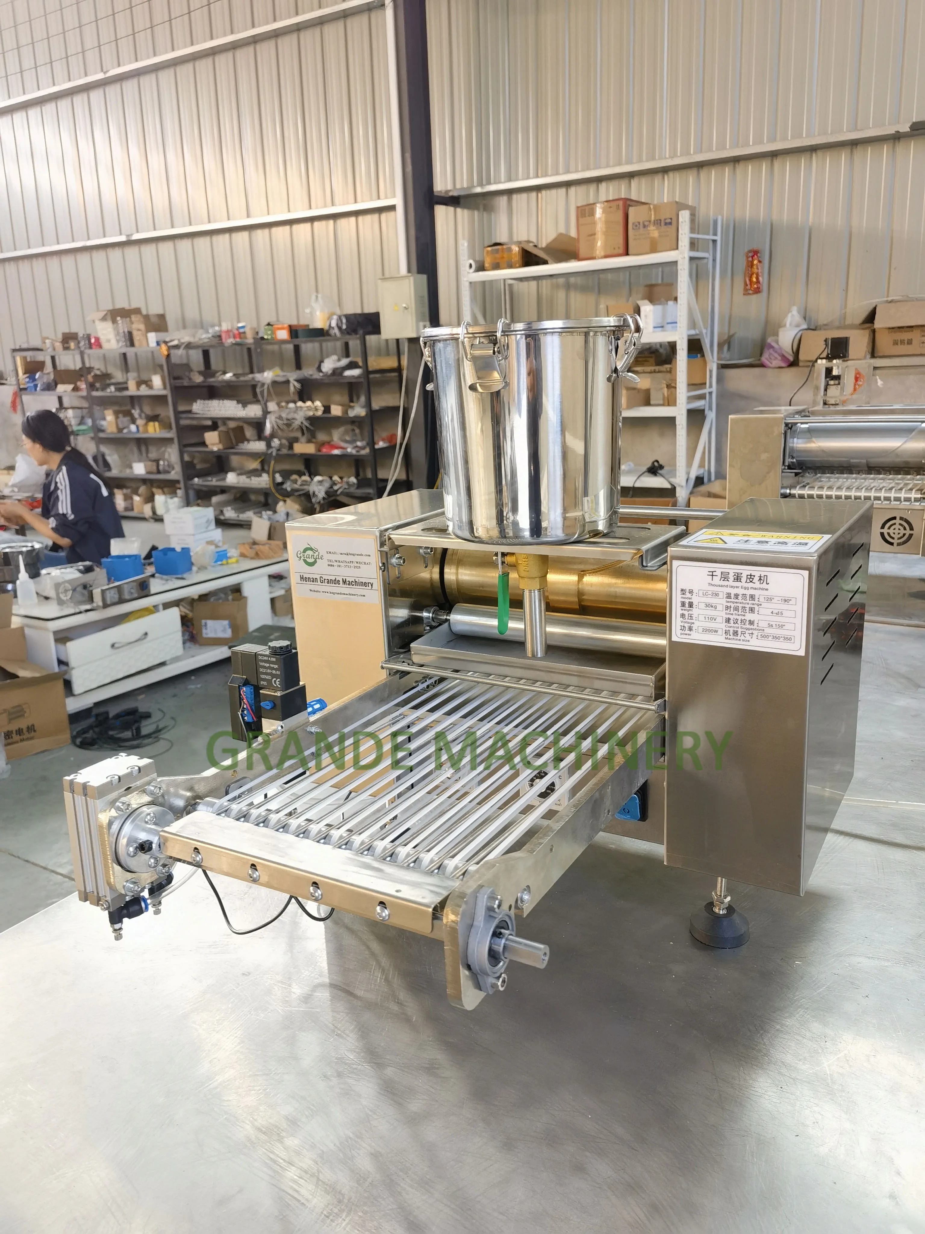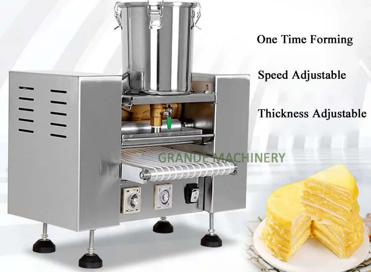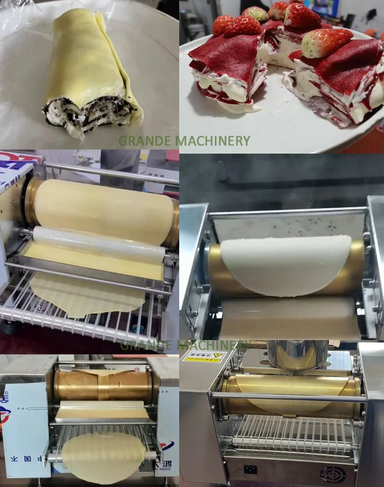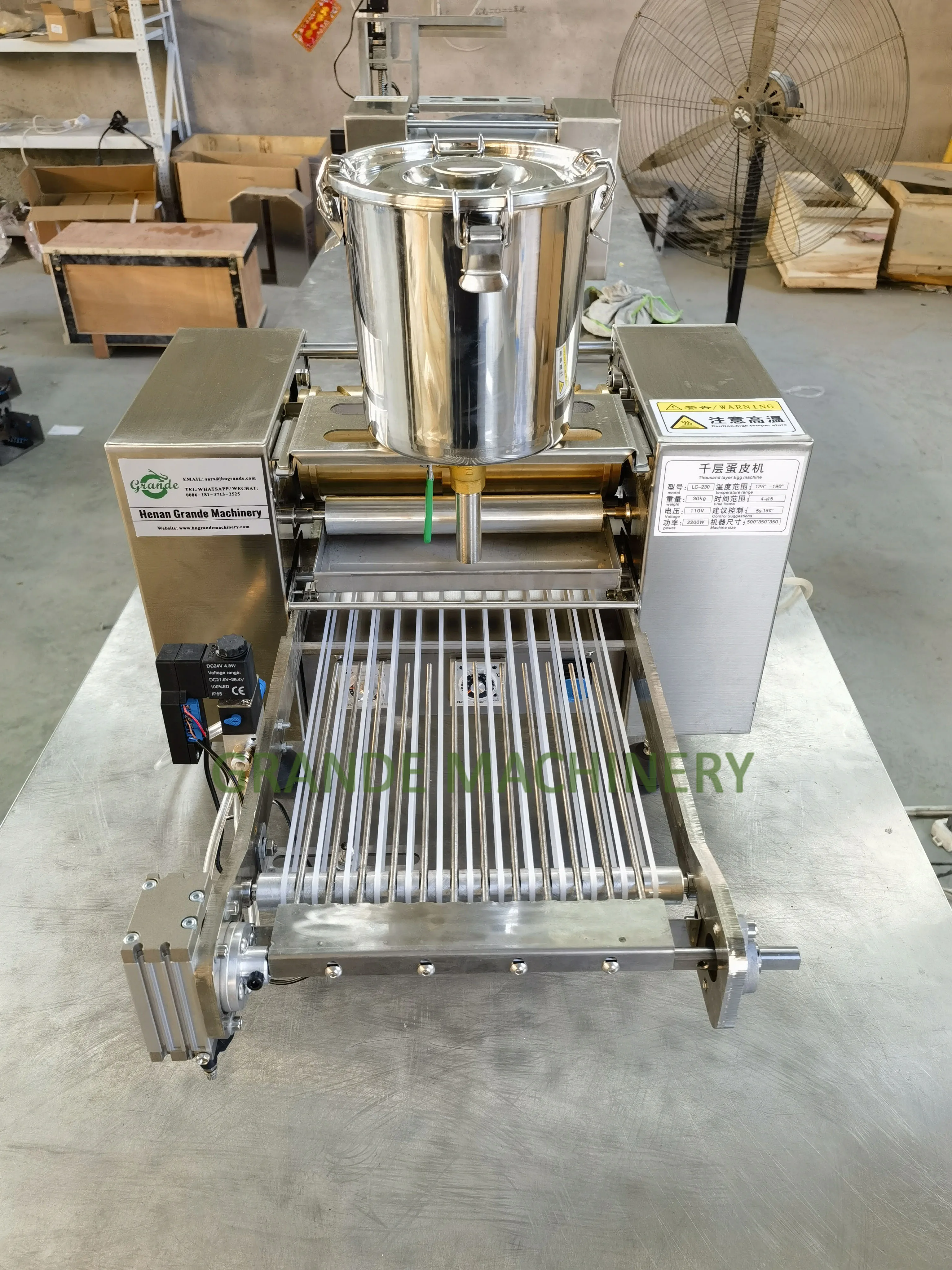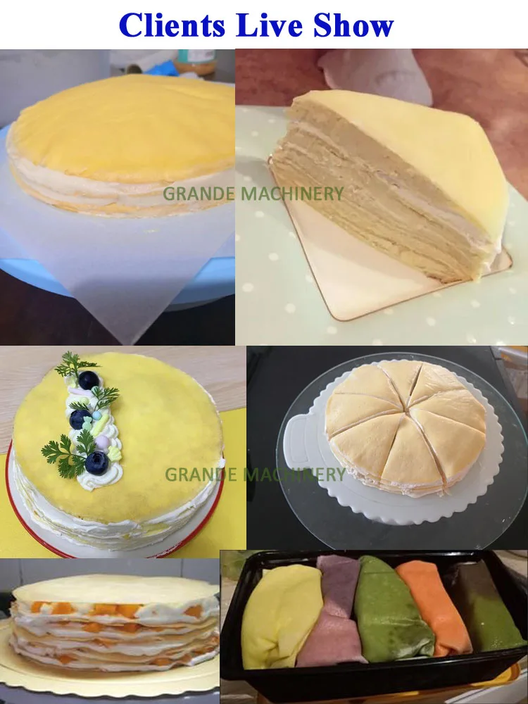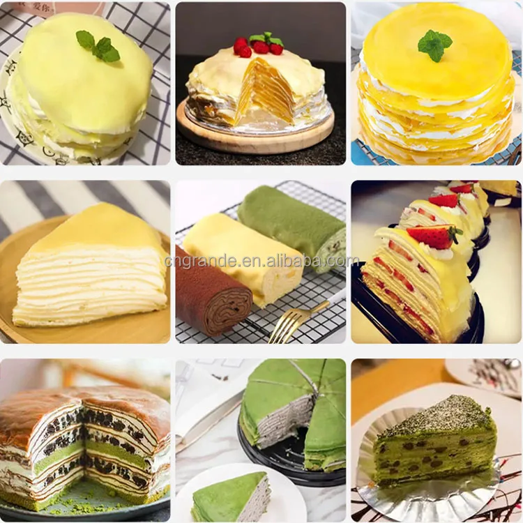 The mille crepe cake/layer cake skin making machine/crepe machine/egg skin machine is used to make crepe skins for mille crepes, egg skins, etc. According to different moulds, it can make 6-inch to 14 inch products, which is convenient and fast.