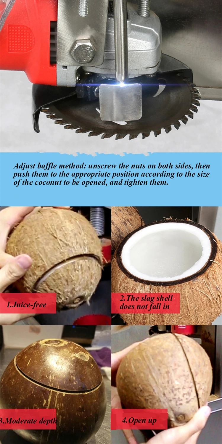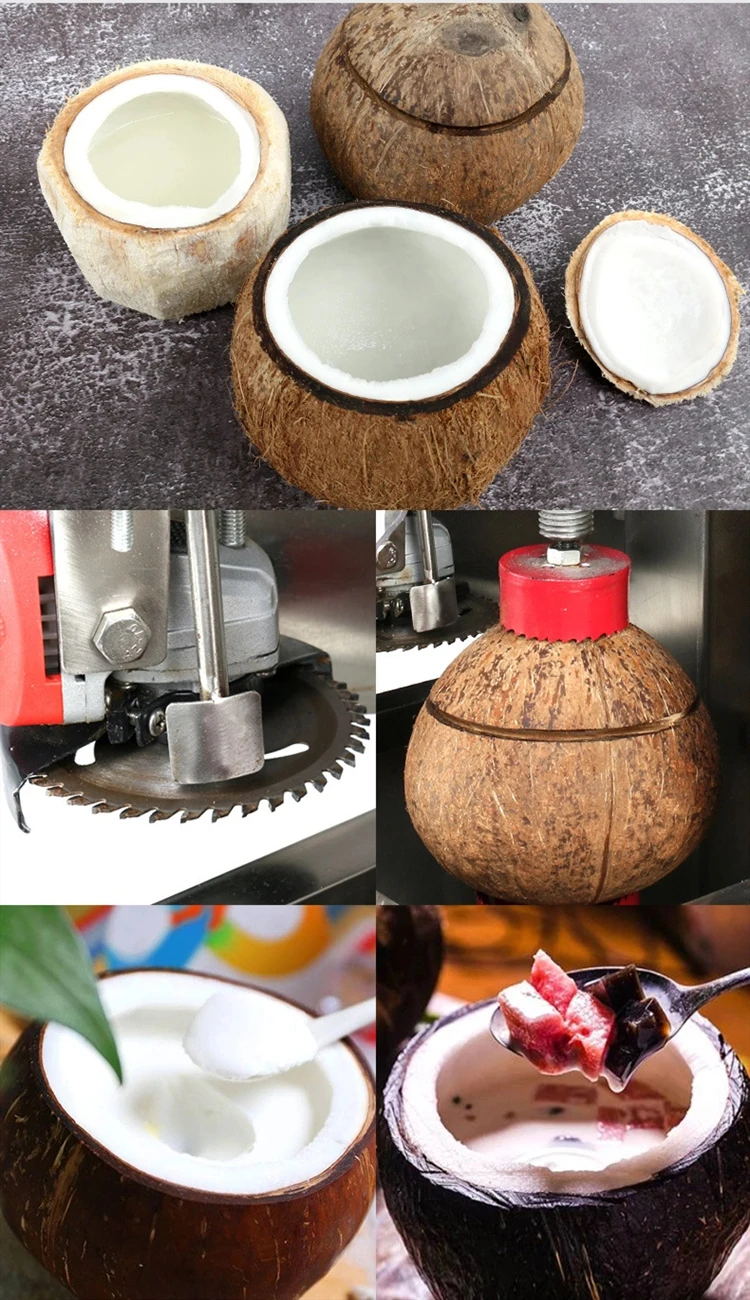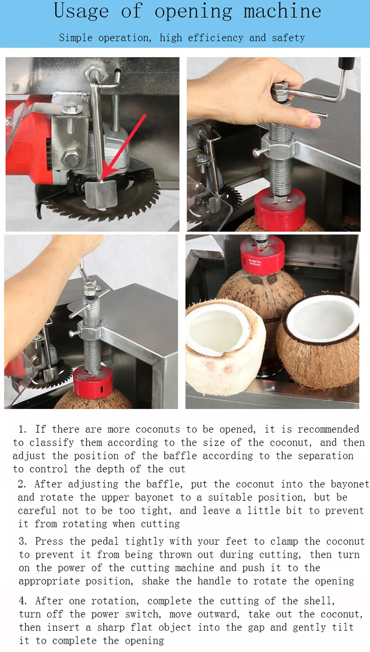 Usage: Commercial coconut opening machine, easy to open, can open different varieties/shapes/sizes of coconut, say goodbye to manual, automatic fast opening.